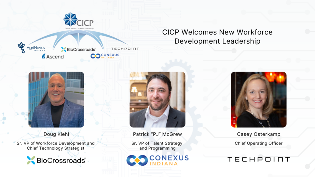INDIANAPOLIS (December 2024) – The Central Indiana Corporate Partnership (CICP), alongside its branded initiatives BioCrossroads, Conexus Indiana and TechPoint, announces the appointment of three senior leaders who will play pivotal roles in shaping the future of Indiana’s life sciences, advanced manufacturing and logistics and technology sectors.